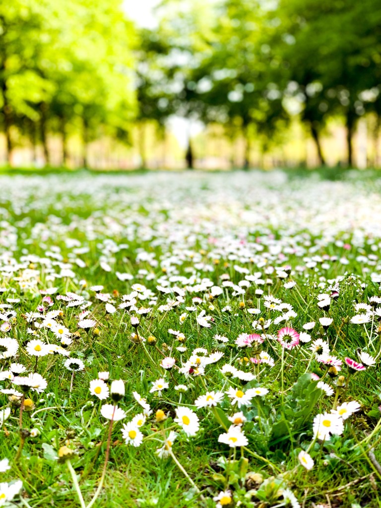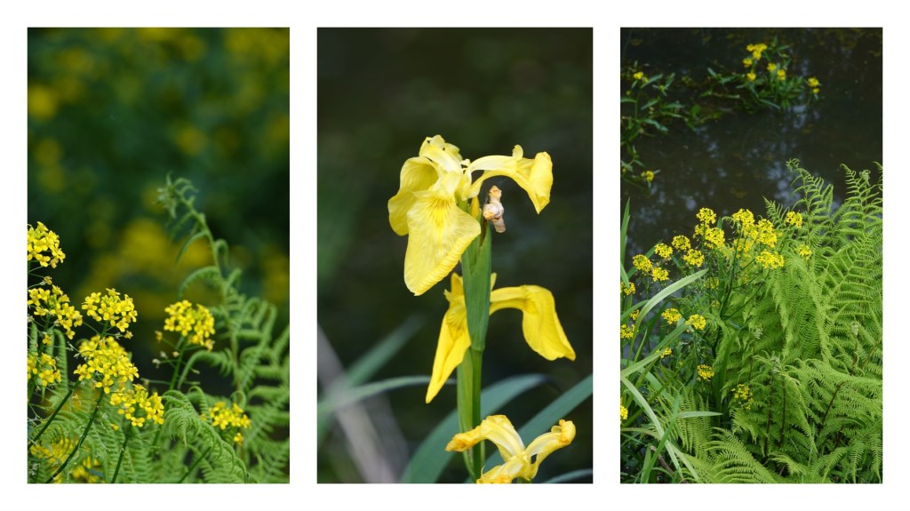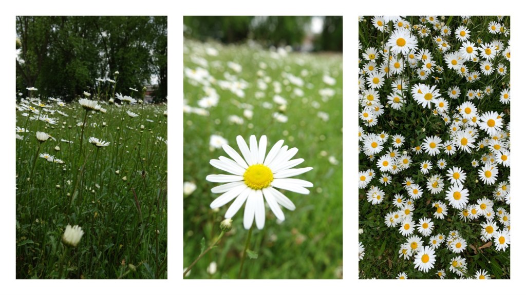 Onderweg kom ik een veld tegen dat vol met margrietjes staat. Zo mooi hoe deze dansen in de wind en in de zon. Het zijn net dansende zonnetjes. Zo mooi. Een beetje verder rij ik langs een brede beek naast de weg. Daar zitten héél wat eendjes en waterkippetjes, met hun jonge kroost. In de beek groeien allerlei mooie gele bloemen die een mooi contrast geven tegen het groene van het gras en de bladeren van de bomen. Vanop de weg zie je er niets van, maar rij je op het fietspad zie je hoe kleurrijk die beek bekleed is. Achter de beek staat een grote serre die ’s morgens prachtig mooi is als het vroeg zonlicht erover schijnt.