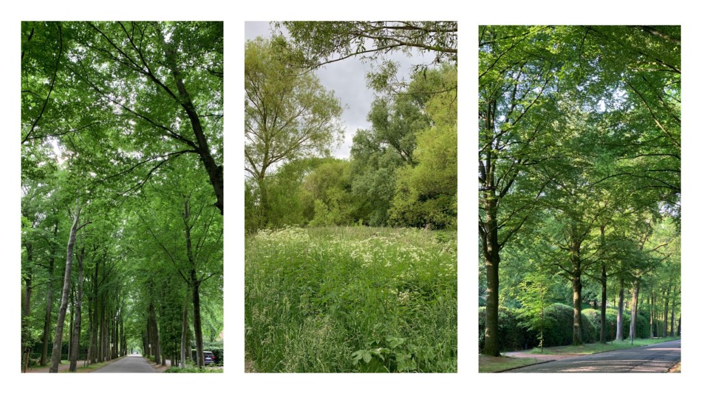 Na een tijdje een drukkere baan te hebben gevolgd kom ik in een echte groene omgeving waar bomen en groen centraal staan in de wijk. De bomen geven de straten een koepel van blaren. Een lichte groene hemel boven je. Er staan ook prachtige huizen die allemaal mooi in het groen baden. Zo kom ik dan aan een pleintje met een stambeeld op waar ieder jaar enorm veel madeliefjes staan. Ze geven de ondergrond een mooie witte tint. Prachtig mooi. Uiteindelijk kom ik stilletjes aan meer en meer toe aan mijn eigen huis. In de straat staan bomen die in het vroege voorjaar witte en roze bloesems geven en nu afwisselend rode en groene bladeren, wat het ook een speciale sfeer geeft.